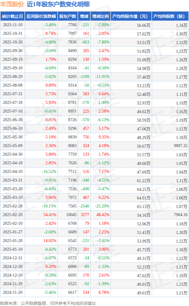 证券之星消息,近日丰茂股份披露,截至2025年11月10日公司股东户数为7766.0户,较10月31日减少231.0户,减幅为2.89%。户均持股数量由上期的1.3万股增加至1.34万股,户均持股市值为56.66万元。