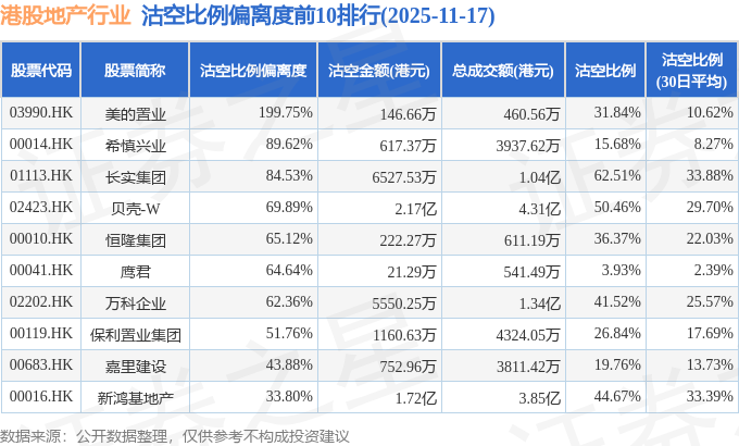 从沽空比例偏离度来看,美的置业、希慎兴业、长实集团沽空比例偏离度位居行业前三,分别为199.75%、89.62%、84.53%。