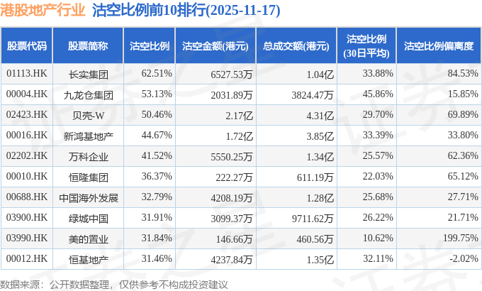 从沽空比例来看,长实集团、九龙仓集团、贝壳-W沽空比例位居行业前三,分别为62.51%、53.13%、50.46%。