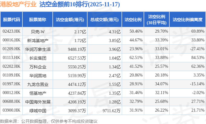 从沽空金额来看,贝壳-W、新鸿基地产、华润万象生活沽空金额位居行业前三,分别为2.17亿港元、1.72亿港元、9488.19万港元。