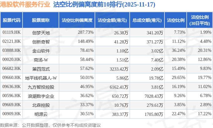 从沽空比例偏离度来看,创梦天地、创新奇智、金山软件沽空比例偏离度位居行业前三,分别为287.73%、148.49%、78.41%。