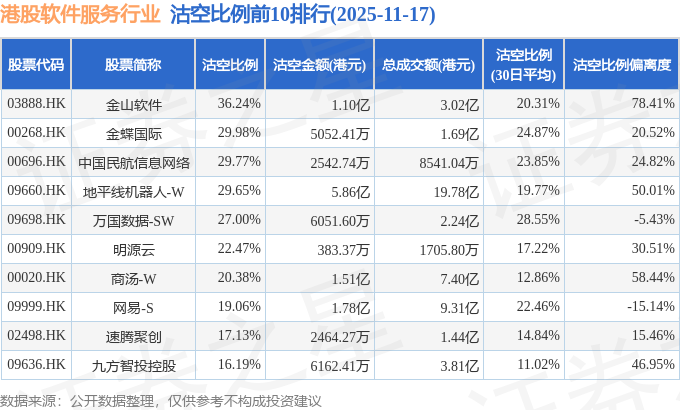 从沽空比例来看,金山软件、金蝶国际、中国民航信息网络沽空比例位居行业前三,分别为36.24%、29.98%、29.77%。