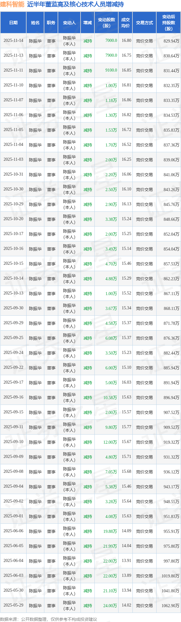 建科智能近半年内的董监高及核心技术人员增减持详情如下: