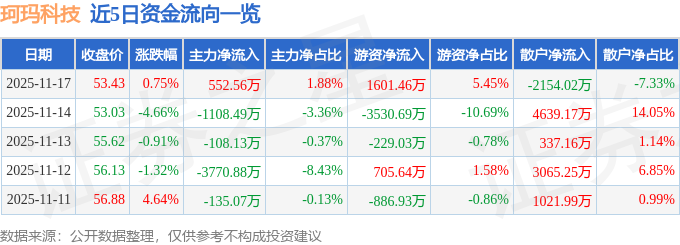 证券之星消息,截至2025年11月17日收盘,珂玛科技(301611)报收于53.43元,上涨0.75%,换手率3.71%,成交量5.43万手,成交额2.94亿元。