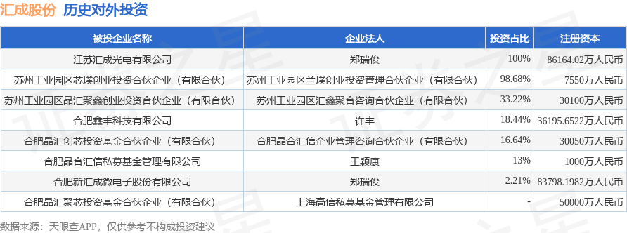证券之星消息,根据天眼查APP显示,汇成股份(688403.SH)新增一起对外投资事件,被投资公司为合肥鑫丰科技有限公司,法定代表人许丰,投资占比为18.44%。该公司从事计算机、通信和其他电子设备制造业,注册资本为36195.6522万人民币。目前,汇成股份共存在对外投资8项,详见下表: