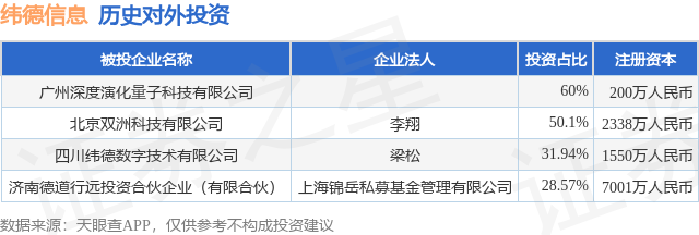 证券之星消息,根据天眼查APP显示,纬德信息(688171.SH)新增一起对外投资事件,被投资公司为广州深度演化量子科技有限公司,法定代表人,投资占比为60%。该公司从事研究和试验发展,注册资本为200万人民币。目前,纬德信息共存在对外投资4项,详见下表: