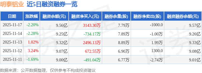 明泰铝业融资融券信息显示,融资方面,当日融资买入7636.22万元,融资偿还4492.92万元,融资净买入3143.3万元。融券方面,融券卖出1.1万股,融券偿还1.2万股,融券余量7.79万股,融券余额117.47万元。融资融券余额9.57亿元。