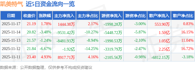11月17日的资金流向数据方面,主力资金净流入1444.38万元,占总成交额2.17%,游资资金净流出1998.28万元,占总成交额3.0%,散户资金净流入553.9万元,占总成交额0.83%。