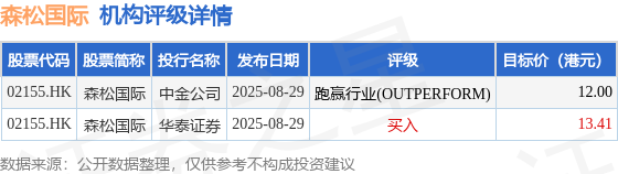 截至2025年11月18日收盘,森松国际(02155.HK)报收于9.47港元,下跌4.92%,成交量446.3万股,成交额4255.77万港元。投行对该股的评级以跑赢行业(OUTPERFORM)为主,近90天内共有1家投行给出跑赢行业(OUTPERFORM)评级,近90天的目标均价为12.7港元。中金公司最新一份研报给予森松国际跑赢行业(OUTPERFORM)评级,目标价12港元。