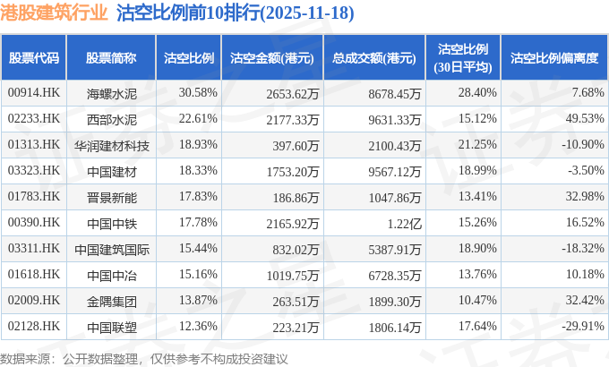 从沽空金额来看,海螺水泥、西部水泥、中国中铁沽空金额位居行业前三,分别为2653.62万港元、2177.33万港元、2165.92万港元。