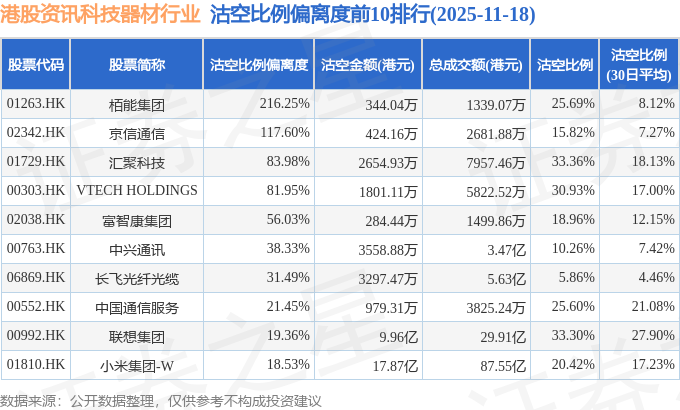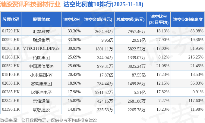 从沽空比例来看,汇聚科技、联想集团、VTECH HOLDINGS沽空比例位居行业前三,分别为33.36%、33.3%、30.93%。