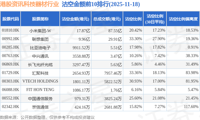 从沽空金额来看,小米集团-W、联想集团、比亚迪电子沽空金额位居行业前三,分别为17.87亿港元、9.96亿港元、9911.52万港元。