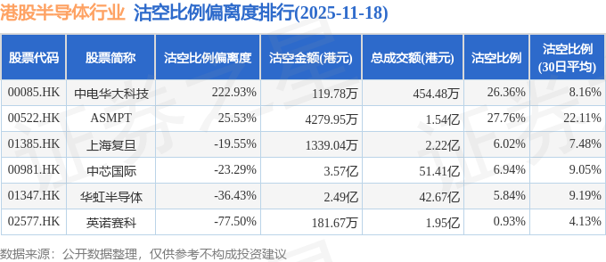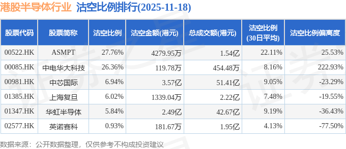 从沽空比例来看,ASMPT、中电华大科技、中芯国际沽空比例位居行业前三,分别为27.76%、26.36%、6.94%。
