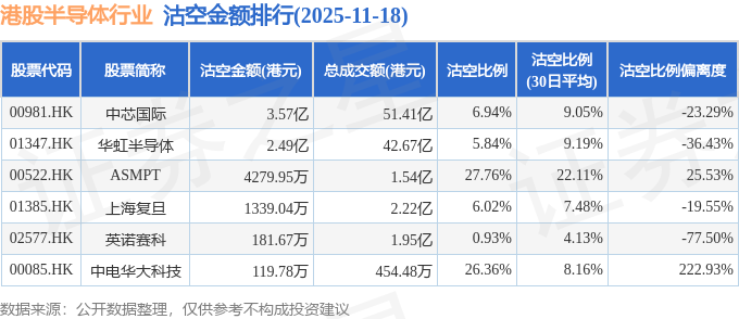 从沽空金额来看,中芯国际、华虹半导体、ASMPT沽空金额位居行业前三,分别为3.57亿港元、2.49亿港元、4279.95万港元。