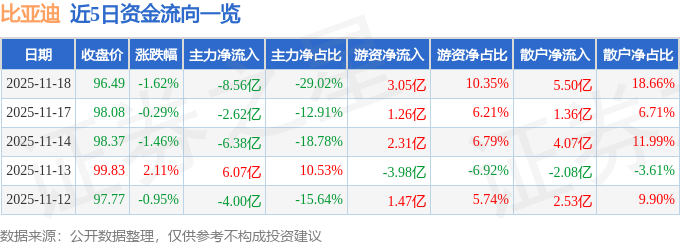 证券之星消息,截至2025年11月18日收盘,比亚迪(002594)报收于96.49元,下跌1.62%,换手率0.87%,成交量30.48万手,成交额29.49亿元。