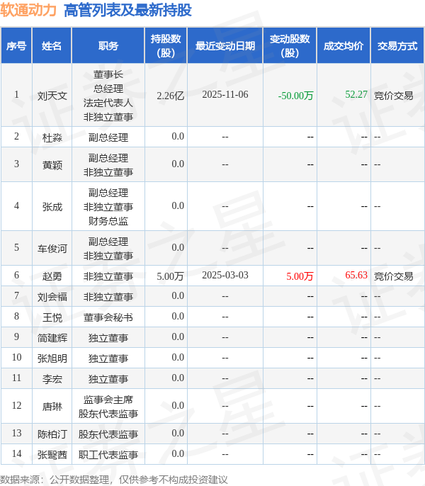 证券之星消息,根据11月18日市场公开信息、上市公司公告及交易所披露数据整理,软通动力(301236)最新董监高及相关人员股份变动情况:2025年11月17日公司董事,高管刘天文共减持公司股份135.32万股,占公司总股本为0.142%。变动期间公司股价上涨5.87%,11月17日当日收盘报51.74元。