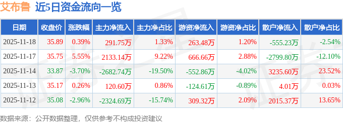 证券之星消息,截至2025年11月18日收盘,艾布鲁(301259)报收于35.89元,上涨0.39%,换手率6.16%,成交量6.09万手,成交额2.19亿元。
