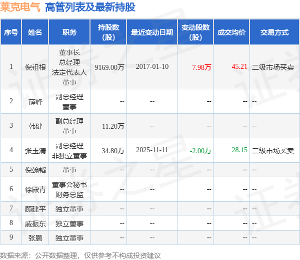 莱克电气的高管列表及最新持股情况如下:
