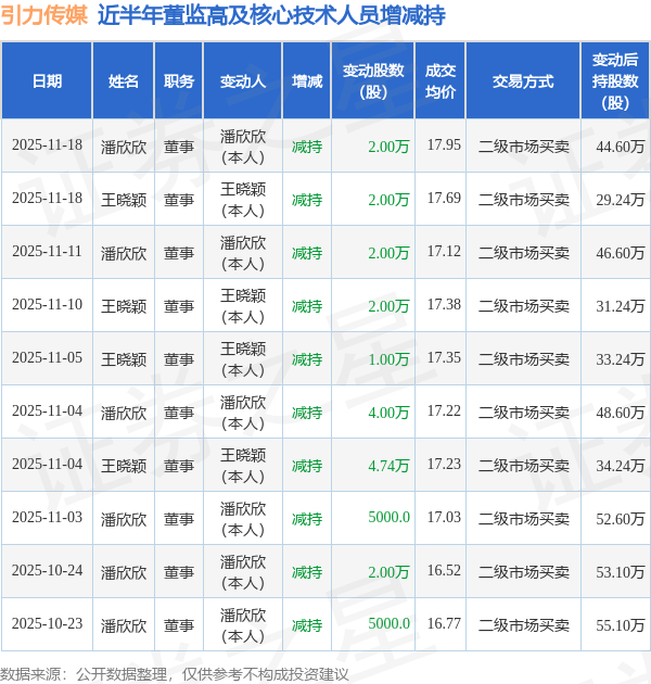 引力传媒近半年内的董监高及核心技术人员增减持详情如下:
