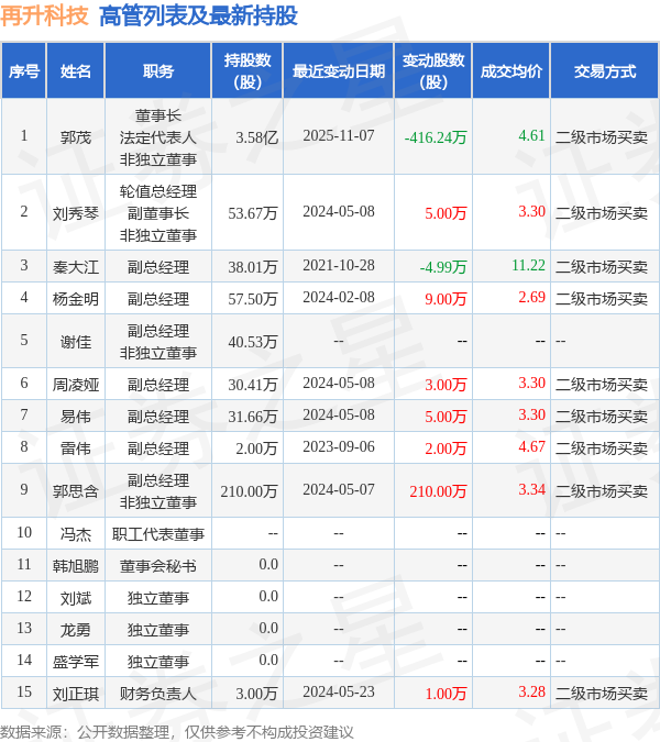 再升科技近半年内的董监高及核心技术人员增减持详情如下: