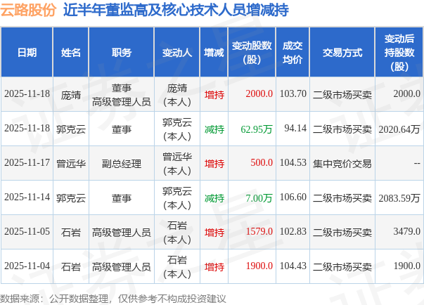 证券之星消息,根据11月19日市场公开信息、上市公司公告及交易所披露数据整理,云路股份(688190)最新董监高及相关人员股份变动情况:2025年11月18日公司董事郭克云共减持公司股份62.95万股,占公司总股本为0.5246%。变动期间公司股价下跌1.25%,11月18日当日收盘报104.04元。