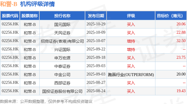 投行对该股的评级以买入为主,近90天内共有6家投行给出买入评级,近90天的目标均价为23.1港元。国元国际最新一份研报给予和誉-B买入评级,目标价20.06港元。