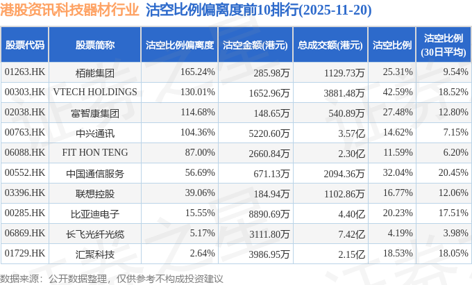 从沽空比例来看,VTECH HOLDINGS、中国通信服务、富智康集团沽空比例位居行业前三,分别为42.59%、32.04%、27.48%。