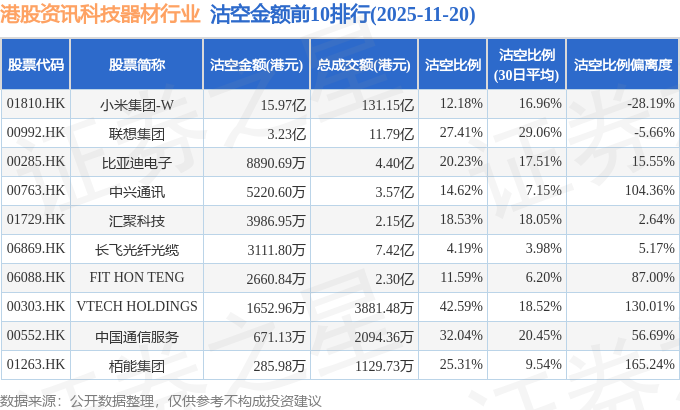 从沽空金额来看,小米集团-W、联想集团、比亚迪电子沽空金额位居行业前三,分别为15.97亿港元、3.23亿港元、8890.69万港元。
