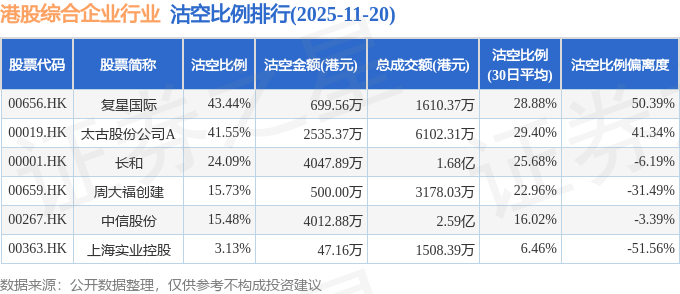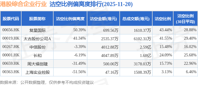 从沽空比例偏离度来看,复星国际、太古股份公司A、中信股份沽空比例偏离度位居行业前三,分别为50.39%、41.34%、-3.39%。