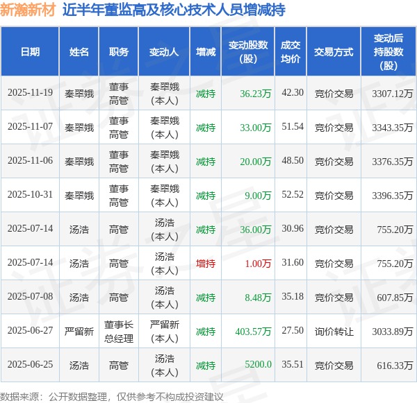 新瀚新材近半年内的董监高及核心技术人员增减持详情如下: