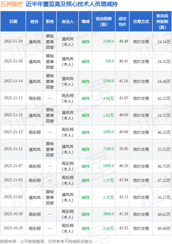 五洲医疗近半年内的董监高及核心技术人员增减持详情如下: