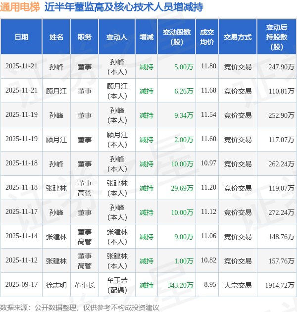 通用电梯近半年内的董监高及核心技术人员增减持详情如下: