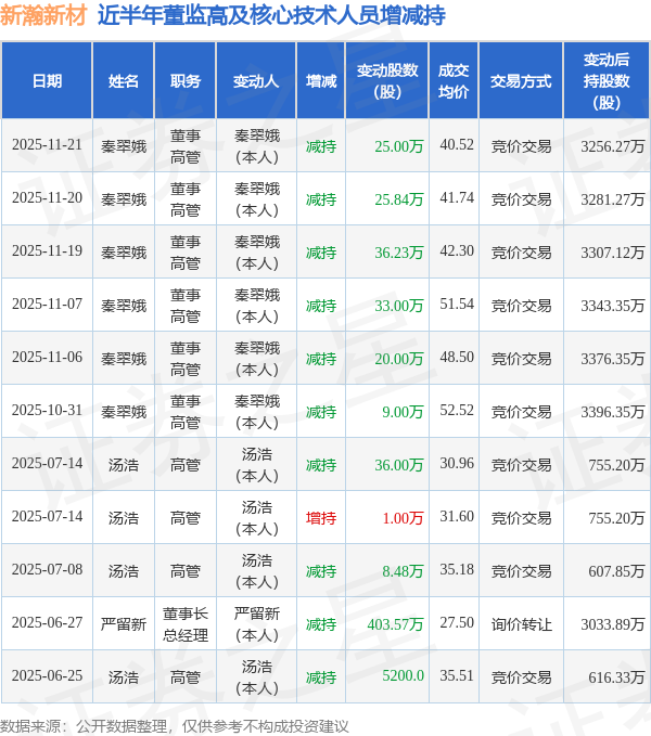 新瀚新材近半年内的董监高及核心技术人员增减持详情如下: