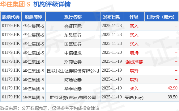 投行对该股的评级以买入为主,近90天内共有4家投行给出买入评级,近90天的目标均价为41.2港元。兴证国际最新一份研报给予华住集团-S买入评级。