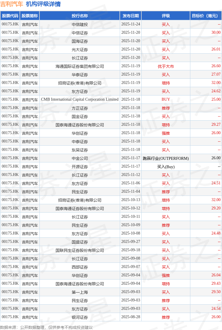 投行对该股的评级以买入为主,近90天内共有20家投行给出买入评级,近90天的目标均价为27.28港元。中信建投最新一份研报给予吉利汽车买入评级。