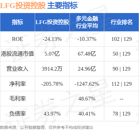 LFG投资控股港股市值5.07亿港元,在多元金融行业中排名第50。主要指标见下表: