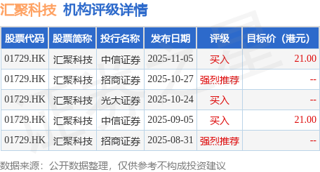 截至2025年11月26日收盘,汇聚科技(01729.HK)报收于16.32港元,上涨0.06%,成交量2148.5万股,成交额3.52亿港元。投行对该股的评级以买入为主,近90天内共有3家投行给出买入评级,近90天的目标均价为21港元。中信证券最新一份研报给予汇聚科技买入评级,目标价21港元。