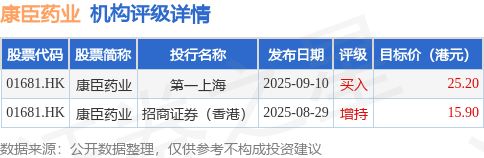 截至2025年11月26日收盘,康臣药业(01681.HK)报收于14.94港元,上涨0.13%,成交量183.6万股,成交额2750.42万港元。投行对该股的评级以增持为主,近90天内共有1家投行给出增持评级,近90天的目标均价为20.55港元。第一上海最新一份研报给予康臣药业买入评级,目标价25.2港元。