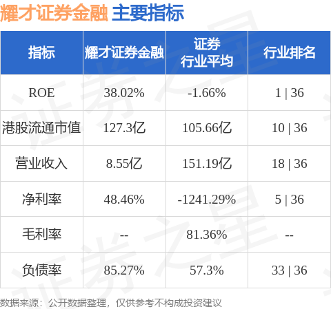 耀才证券金融港股市值127.3亿港元,在证券行业中排名第10。主要指标见下表: