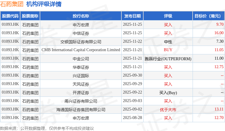 截至2025年11月26日收盘,石药集团(01093.HK)报收于7.95港元,上涨2.32%,成交量1.47亿股,成交额11.91亿港元。投行对该股的评级以买入为主,近90天内共有7家投行给出买入评级,近90天的目标均价为11.66港元。海通国际证券集团有限公司最新一份研报给予石药集团优于大市评级,目标价11.34港元。