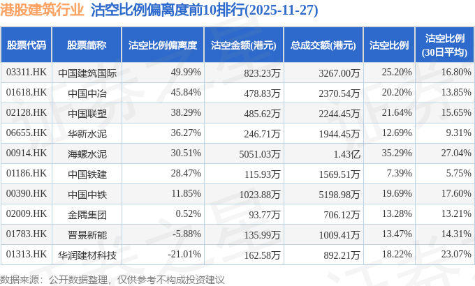 从沽空比例偏离度来看,中国建筑国际、中国中冶、中国联塑沽空比例偏离度位居行业前三,分别为49.99%、45.84%、38.29%。