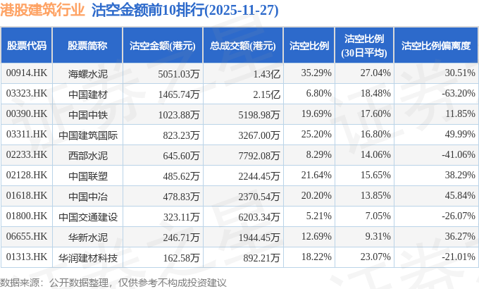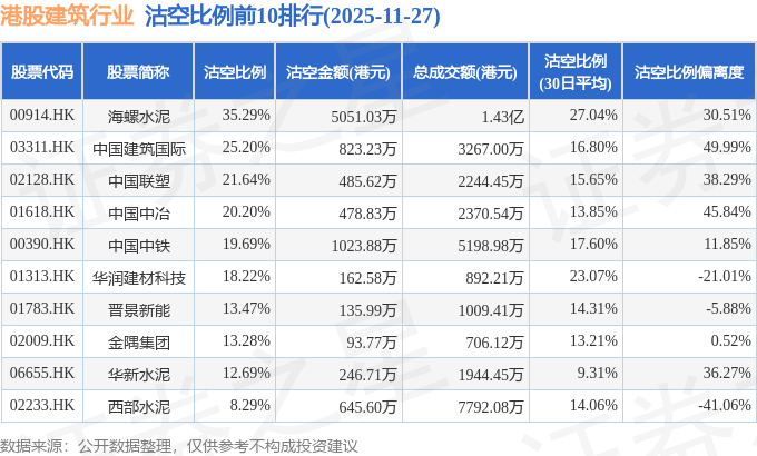 从沽空比例来看,海螺水泥、中国建筑国际、中国联塑沽空比例位居行业前三,分别为35.29%、25.2%、21.64%。
