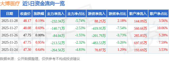 证券之星消息,截至2025年11月28日收盘,大博医疗(002901)报收于48.17元,上涨0.19%,换手率0.29%,成交量8424.0手,成交额4046.19万元。