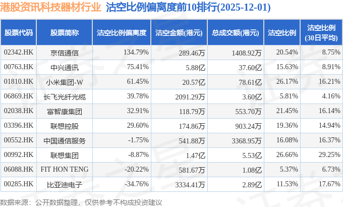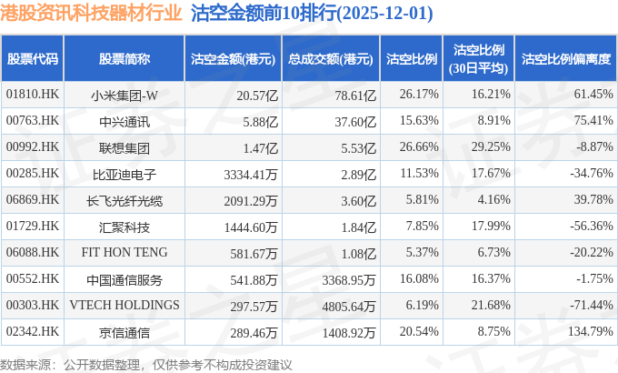 从沽空比例偏离度来看,京信通信、中兴通讯、小米集团-W沽空比例偏离度位居行业前三,分别为134.79%、75.41%、61.45%。