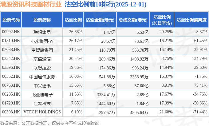 从沽空比例来看,联想集团、小米集团-W、富智康集团沽空比例位居行业前三,分别为26.66%、26.17%、21.45%。