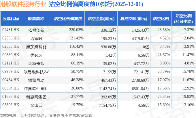 证券之星消息,12月1日港交所披露数据显示,当日港股软件服务行业的154只个股中有40只被沽空,总沽空股数为1.04亿股,总沽空金额为17.62亿元(港元),而当日软件服务行业的总成交金额为138.86亿元(港元),沽空比例为12.69%。当日软件服务行业总体涨1.02%。