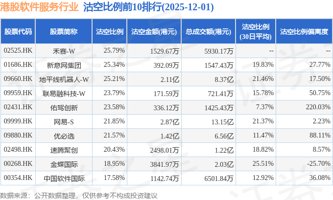 从沽空比例来看,禾赛-W、新意网集团、地平线机器人-W沽空比例位居行业前三,分别为25.79%、25.34%、25.21%。