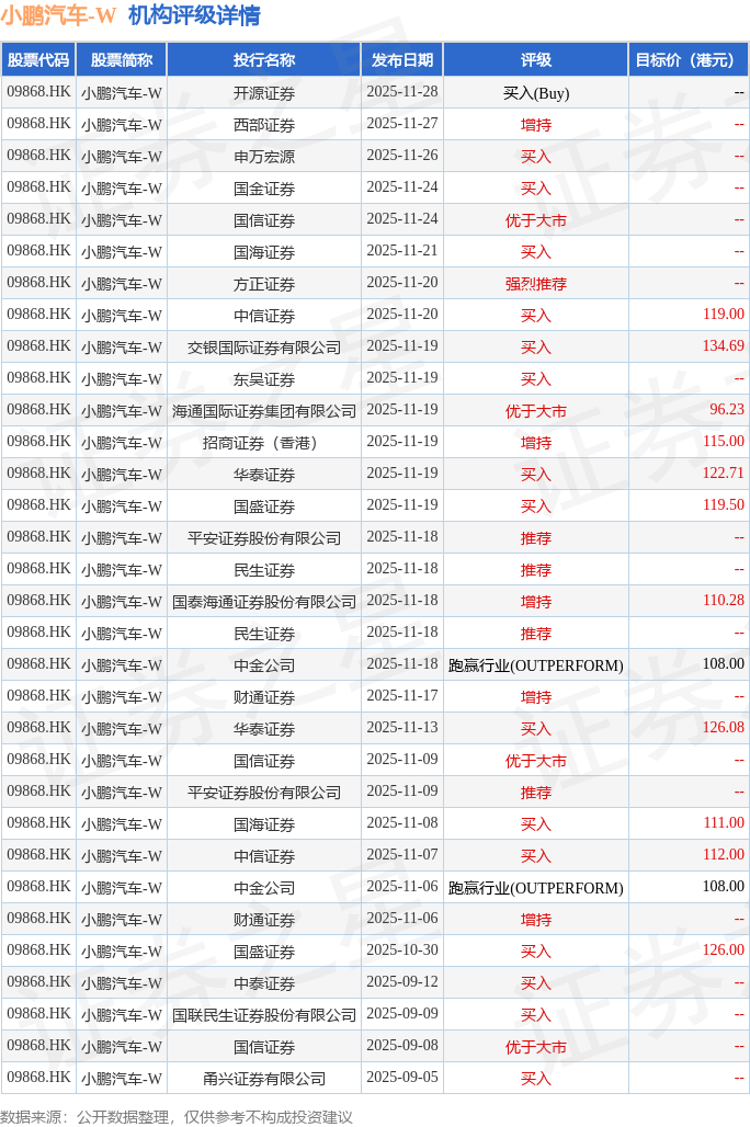 截至2025年12月1日收盘,小鹏汽车-W(09868.HK)报收于83.35港元,下跌0.66%,成交量1238.87万股,成交额10.32亿港元。投行对该股的评级以买入为主,近90天内共有15家投行给出买入评级,近90天的目标均价为116.04港元。开源证券最新一份研报给予小鹏汽车-W买入(Buy)评级。