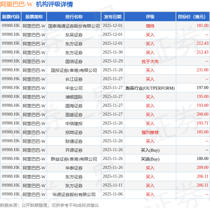 截至2025年12月1日收盘,阿里巴巴-W(09988.HK)报收于154.9港元,上涨2.24%,成交量9325.92万股,成交额144.94亿港元。投行对该股的评级以买入为主,近90天内共有34家投行给出买入评级,近90天的目标均价为195.57港元。国泰海通证券股份有限公司最新一份研报给予阿里巴巴-W增持评级,目标价181港元。