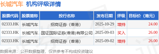 截至2025年12月1日收盘,长城汽车(02333.HK)报收于14.8港元,下跌1.14%,成交量1520.08万股,成交额2.26亿港元。投行对该股的评级以增持为主,近90天内共有2家投行给出增持评级,近90天的目标均价为25.33港元。招商证券(香港)最新一份研报给予长城汽车增持评级,目标价24港元。